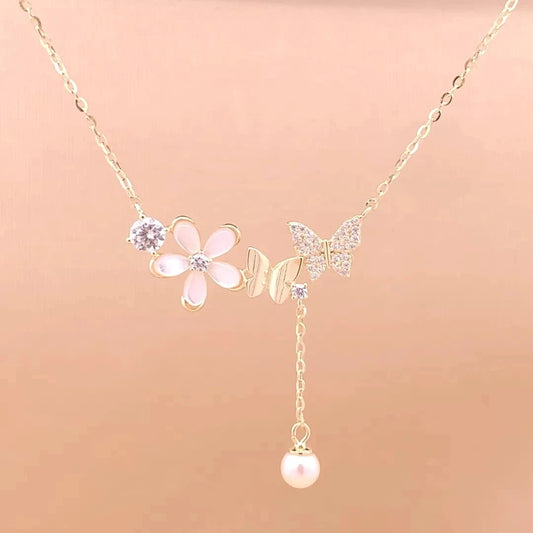 Blooming Butterfly Pearl Drop Pendant Chain (Pure Silver) - Gold