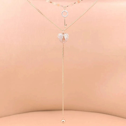 Double Layer Heart Lock and Key Pendant Chain (Pure Silver) - Rose Gold