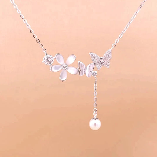 Blooming Butterfly Pearl Drop Pendant Chain (Pure Silver) - Silver