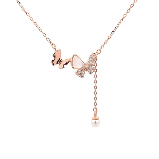 Duo Butterfly With Pearl Drop Pendant Chain (Pure Silver) - Rose Gold