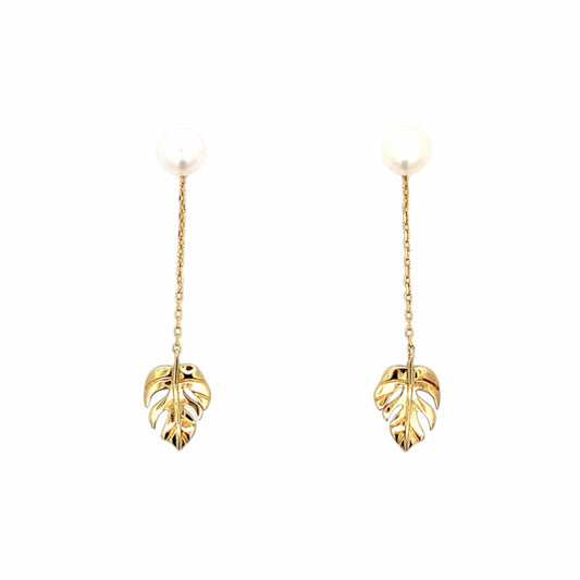 Monstera Pearl Drop Earrings (Pure Silver) - Gold