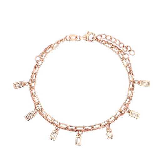 Double Layer Baguette Dangle Drop Bracelet (Pure Silver) - Rose Gold