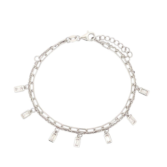 Double Layer Baguette Dangle Drop Bracelet (Pure Silver) - Silver
