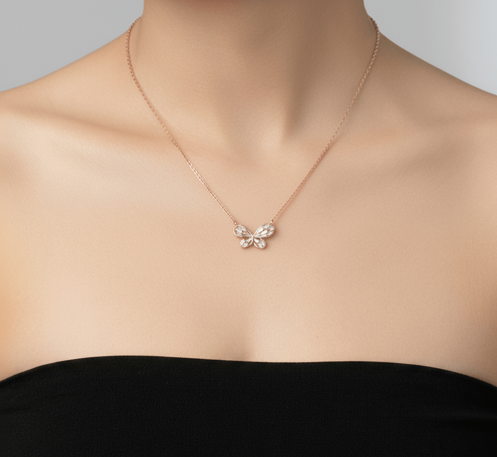 Unleash the magic within with our Baguette Wings pendant chain, a spellbinding masterpiece that whispers secrets of enchantment. This bewitching design features delicate butterfly-inspired silhouettes, expertly crafted with baguette-cut stones that shimmer like stardust. Whether you're a dreamer, a believer, or a wanderer, the Baguette Wings pendant chain is the perfect accessory to unlock your inner sparkle. Adorn yourself with the essence of magic. Wear the Baguette Wings pendant chain and soar on the wings of wonder.