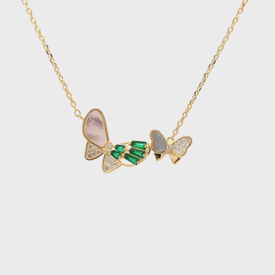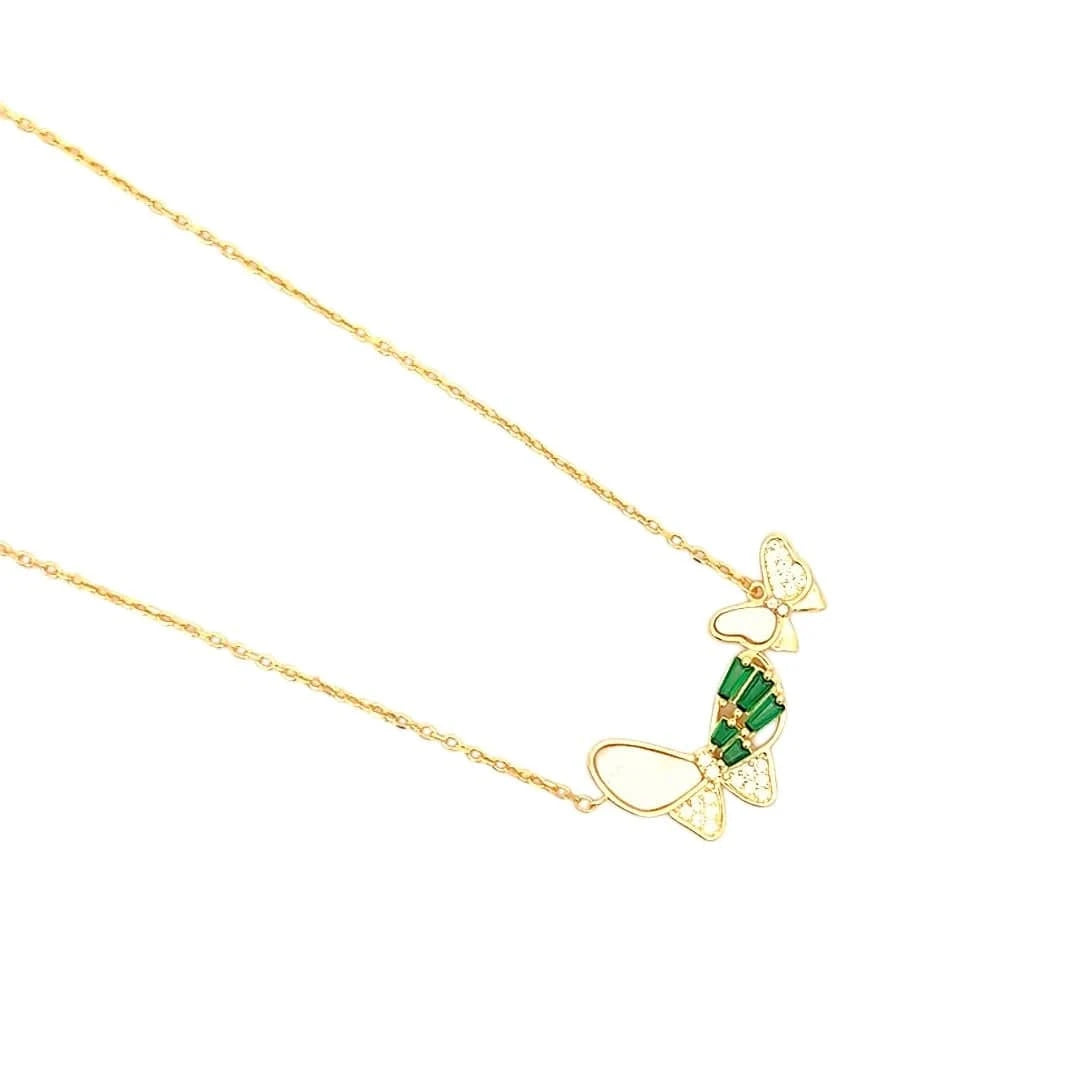 Heavenly and enchanting, our Celestara Duo Butterfly Pendant Chain embodies the beauty of transformation and the harmony of two souls in flight. The bold butterfly shimmers with luminous mother of pearl on one wing, a vibrant green baguette on the other, and sparkling cubic zirconia along its base, creating a breathtaking balance of color and light. At its tip, a delicate smaller butterfly adorned with mother of pearl and cubic zirconia completes the mesmerizing design, symbolizing unity, grace, and new beginnings. Whether gifted as a token of love or worn as a reflection of your own elegance, the Celestara Duo Butterfly Pendant Chain radiates celestial sophistication. Let its heavenly wings carry your spirit with grace, beauty, and endless possibility.