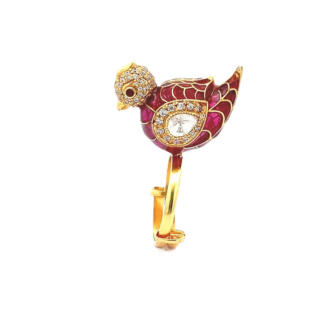 Adorning its graceful form, Polki Kundan stones glimmer along the sides, their uncut brilliance recalling treasures once cherished in the crowns and heirlooms of royalty. The parrot’s head, lavishly encrusted with clusters of sparkling stones, gleams like a miniature diadem — capturing light with every turn and movement. The seamless fusion of meenakari artistry, Kundan brilliance, and intricate detailing tells a story of opulence, mastery, and sovereign allure.