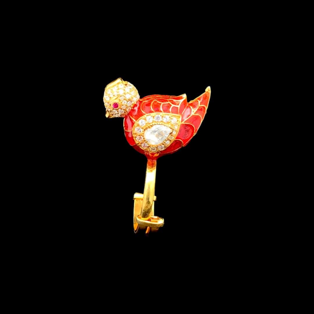 Adorning its graceful form, Polki Kundan stones glimmer along the sides, their uncut brilliance recalling treasures once cherished in the crowns and heirlooms of royalty. The parrot’s head, lavishly encrusted with clusters of sparkling stones, gleams like a miniature diadem — capturing light with every turn and movement. The seamless fusion of meenakari artistry, Kundan brilliance, and intricate detailing tells a story of opulence, mastery, and sovereign allure.