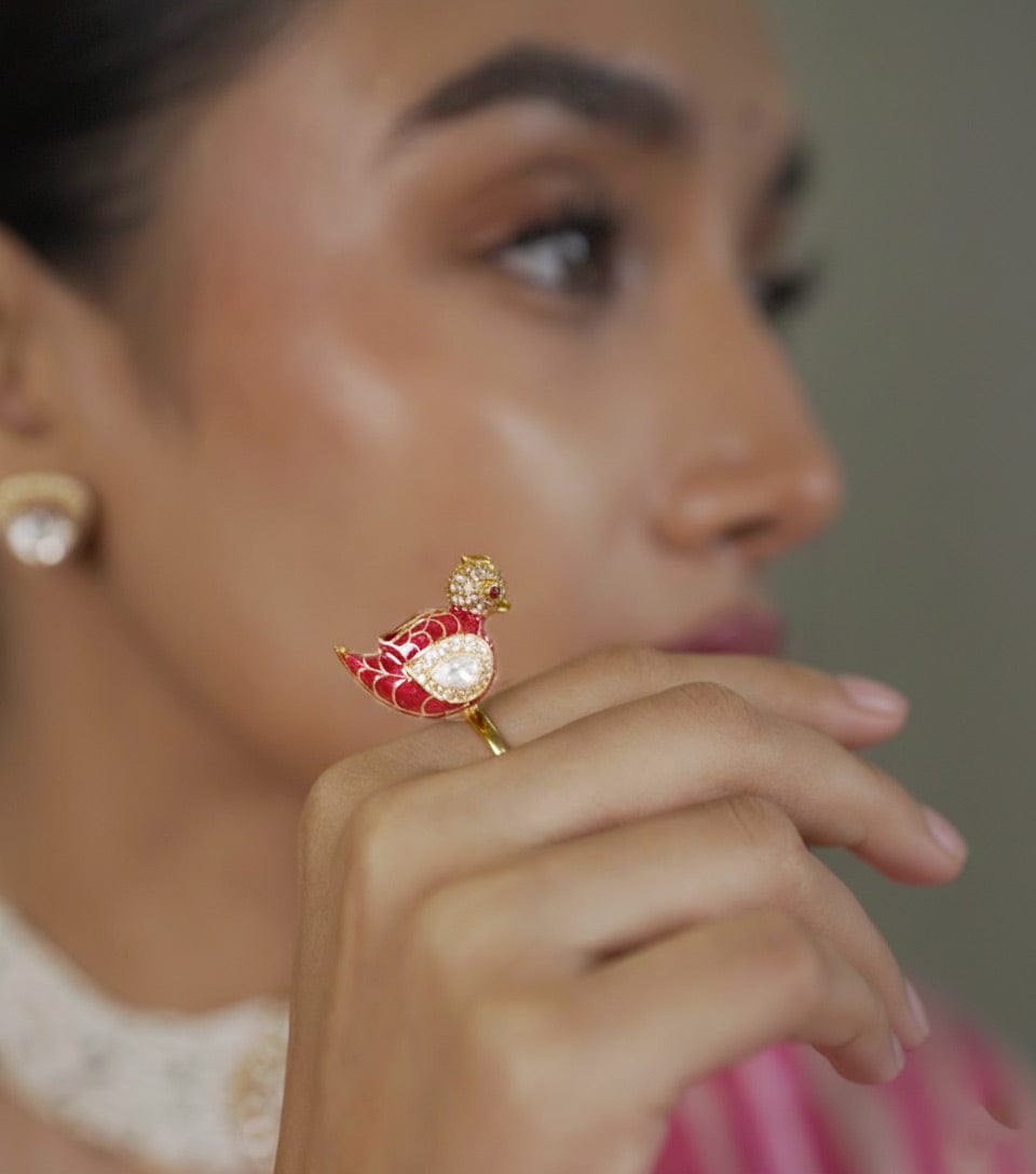 Celebrate the eternal messenger of love, joy, and prosperity with our Empress Parrot Ring — a creation that brings timeless symbolism to life in resplendent meenakari hues. For centuries, the parrot has been revered as a harbinger of harmony and abundance, and here it comes alive in four regal palettes: Vibrant Green, Majestic Magenta, Royal Blue, and Radiant Orange. Each hue radiates vitality and symbolism, transforming the jewel into a living ode to color, culture, and craftsmanship.
