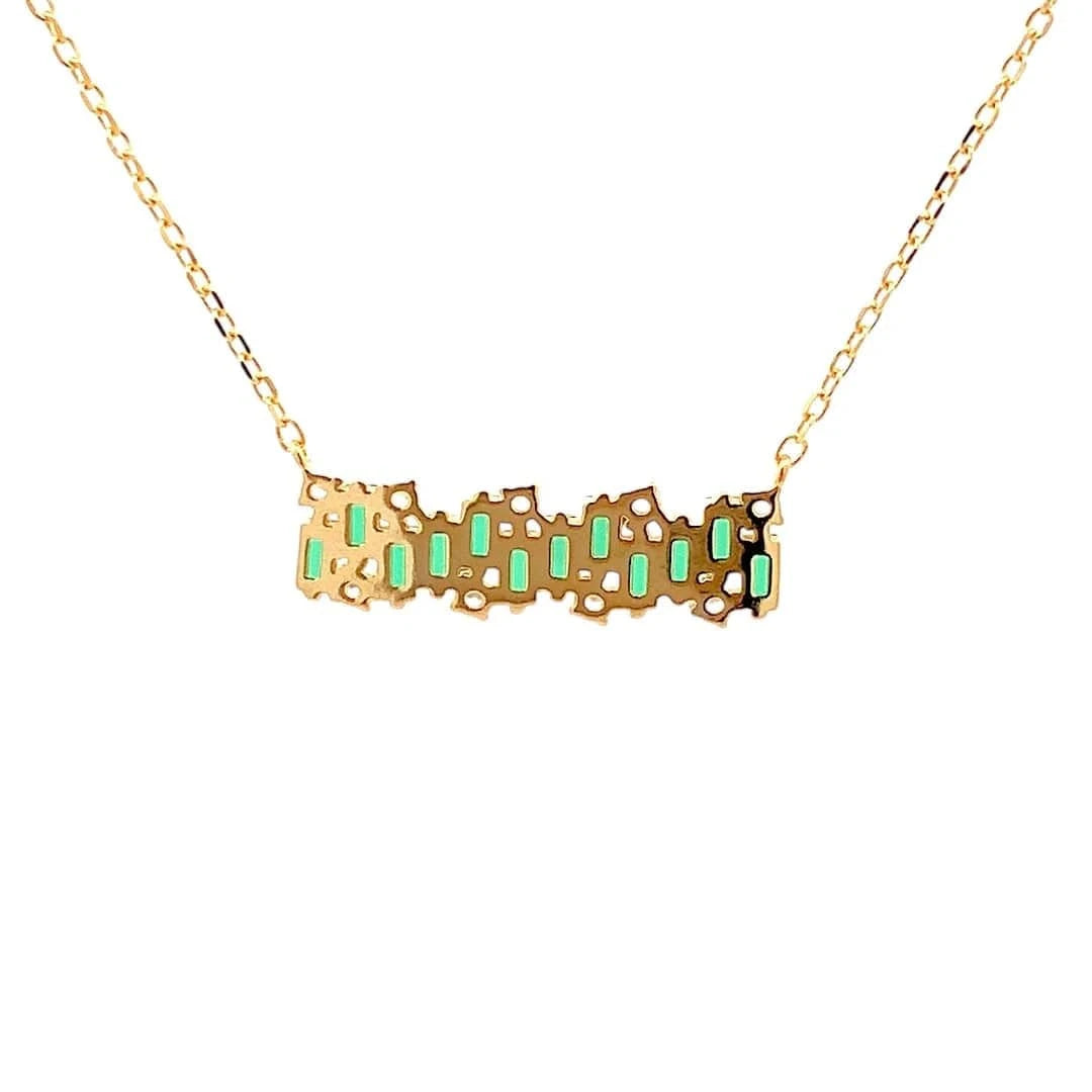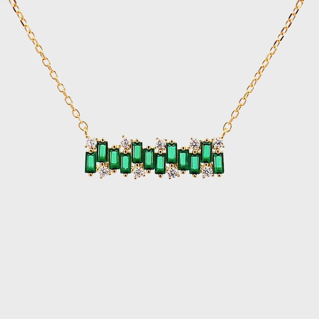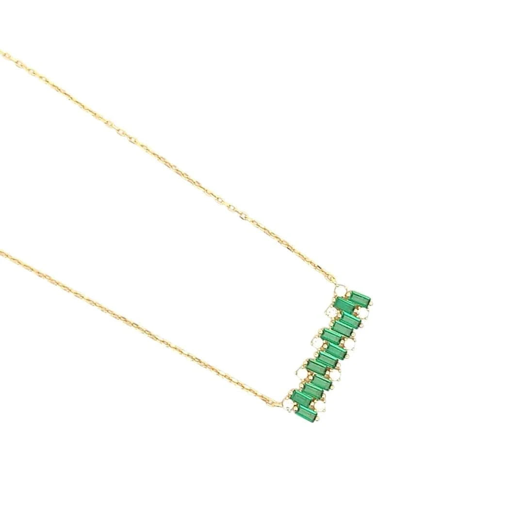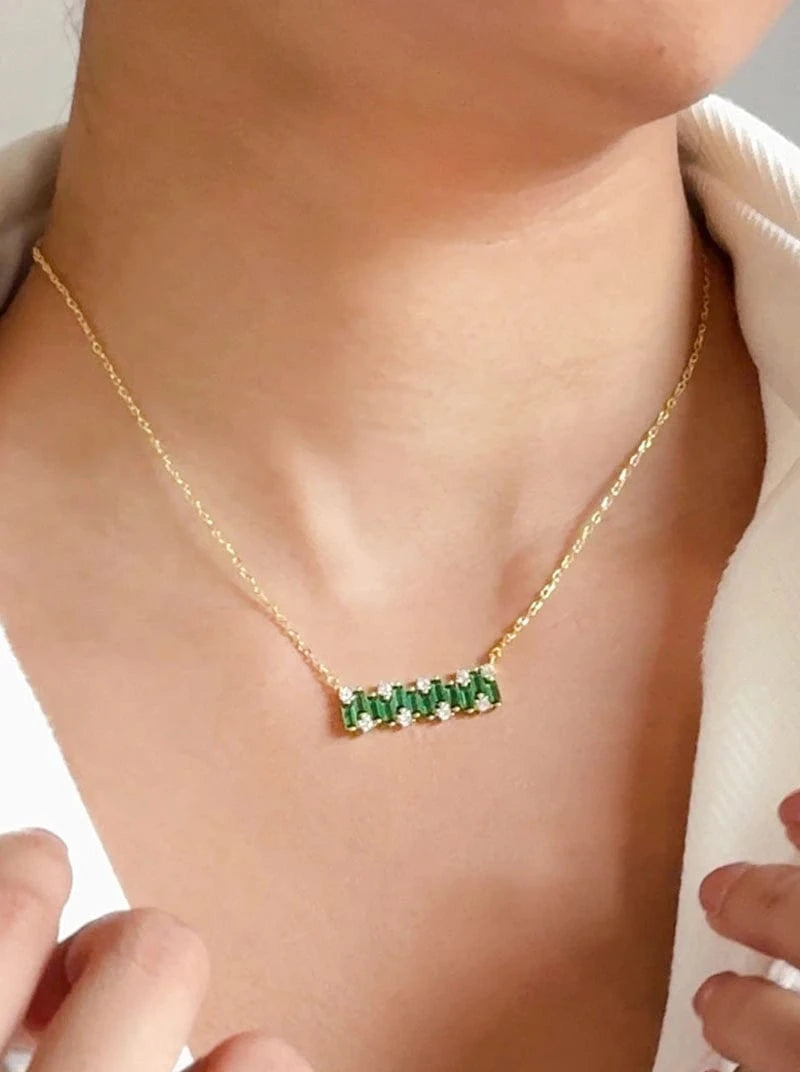 Celebrate the elegance of color and modern design with our Green Baguette Bar Pendant Chain. Vibrant green baguette stones are arranged along a polished bar, each catching the light to create a subtle yet captivating shimmer. Suspended on a refined chain, this pendant blends contemporary sophistication with timeless charm, making it a striking statement for any occasion. Whether gifted or worn as an expression of your personal style, the Green Baguette Bar Pendant Chain embodies grace, poise, and effortless refinement. Let its vibrant green baguettes illuminate your look with elegant brilliance.
