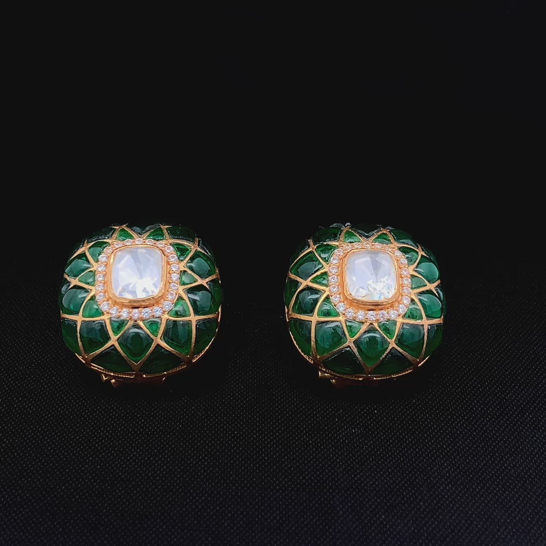 The fusion of Polki and Kundan transforms these earrings into a statement of majesty, reflecting the grandeur of heritage craftsmanship in every curve and contour. With graceful movement, they frame the face in imperial brilliance, carrying with them the allure of jewels meant for queens. Secured with a dual lock for a flawless and comfortable fit, they ensure elegance remains as enduring as their artistry.