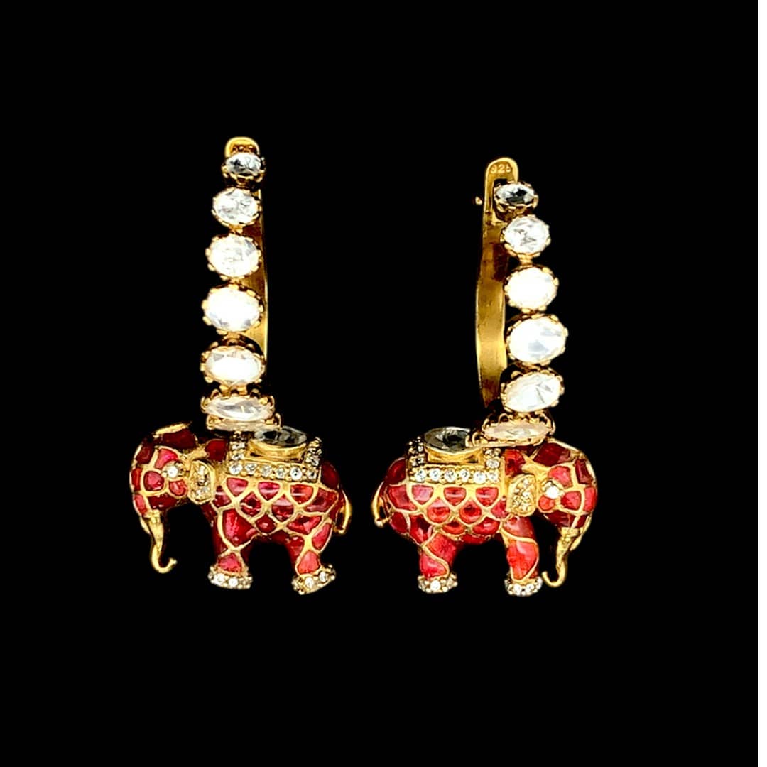 The earrings echo this magnificence with a unique design — Polki-studded hoops, graduating from smaller to larger stones, designed in a comfortable clip-on style for effortless wear. From each hoop descends a royal elephant drop, richly decorated in meenakari and Polki brilliance. Together, they frame the face with imperial charm, balancing artistry with elegance in every curve and shimmer.
