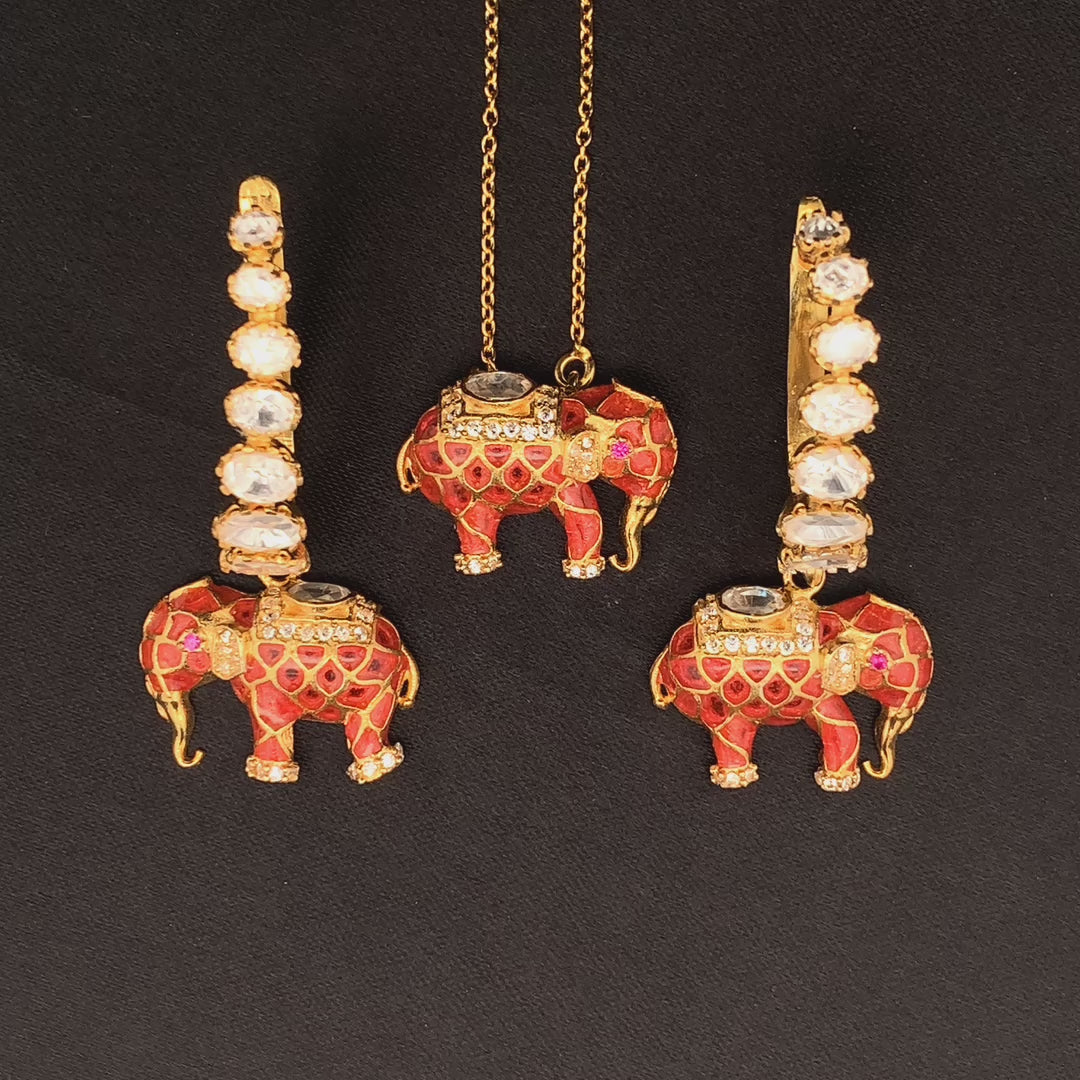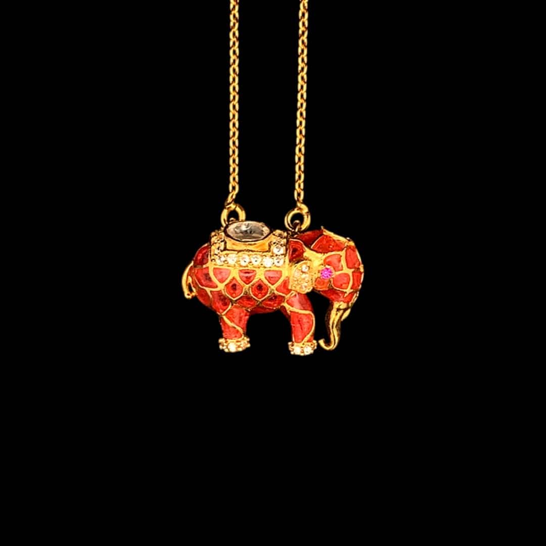 Suspended from the chain, the pendant embodies royal artistry, bringing to life the grandeur of heritage design through its magnificent elephant motif. Adorned with vibrant meenakari and luminous Polki accents, the pendant reflects the strength, wisdom, and auspicious fortune elephants have symbolized in royal courts for centuries. Each detail is crafted to capture movement and majesty, transforming the necklace into a talisman of prosperity and grace.