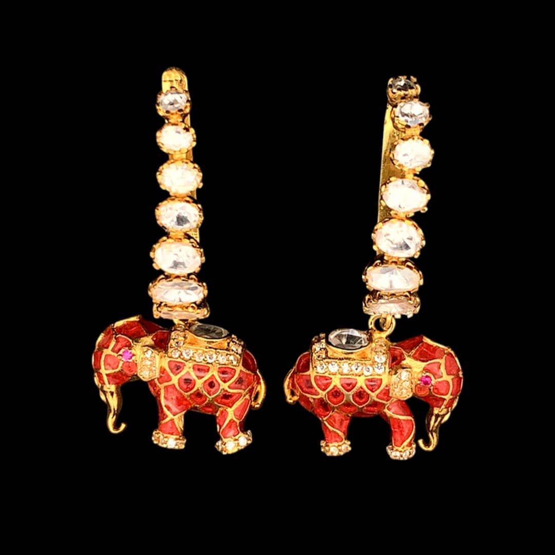 The earrings echo this magnificence with a unique design — Polki-studded hoops, graduating from smaller to larger stones, designed in a comfortable clip-on style for effortless wear. From each hoop descends a royal elephant drop, richly decorated in meenakari and Polki brilliance. Together, they frame the face with imperial charm, balancing artistry with elegance in every curve and shimmer.