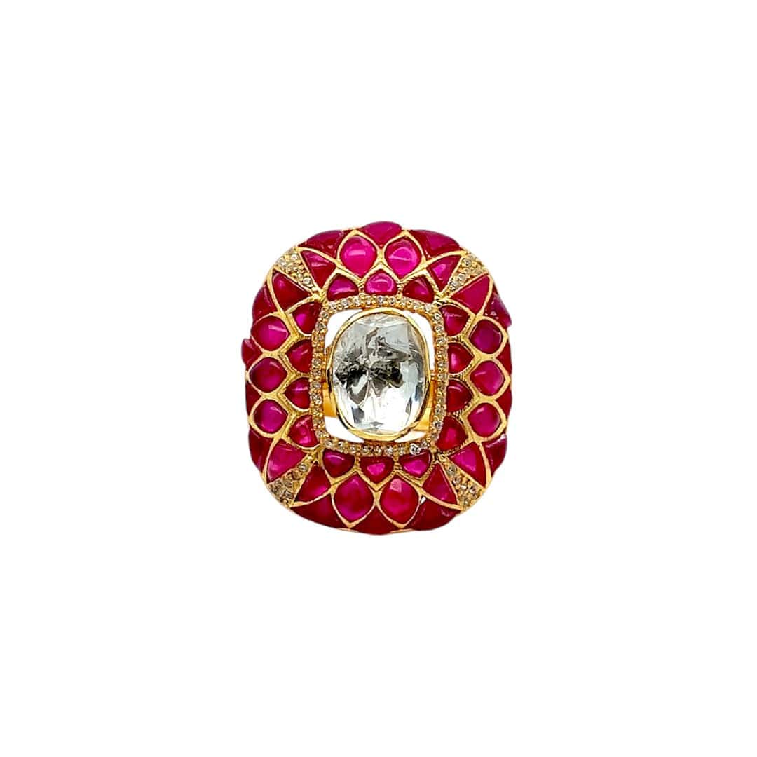 Our Padmira Ring is a vision of regal magnificence, where imperial artistry takes form in a stately rectangular silhouette fit for royalty. At its heart rests a luminous Polki stone — uncut, radiant, and timeless — glowing with the soulful brilliance of dynastic jewels. Around this centerpiece, intricate Kundan work unfurls in perfect harmony, its sovereign shimmer weaving richness into the design with impeccable precision.