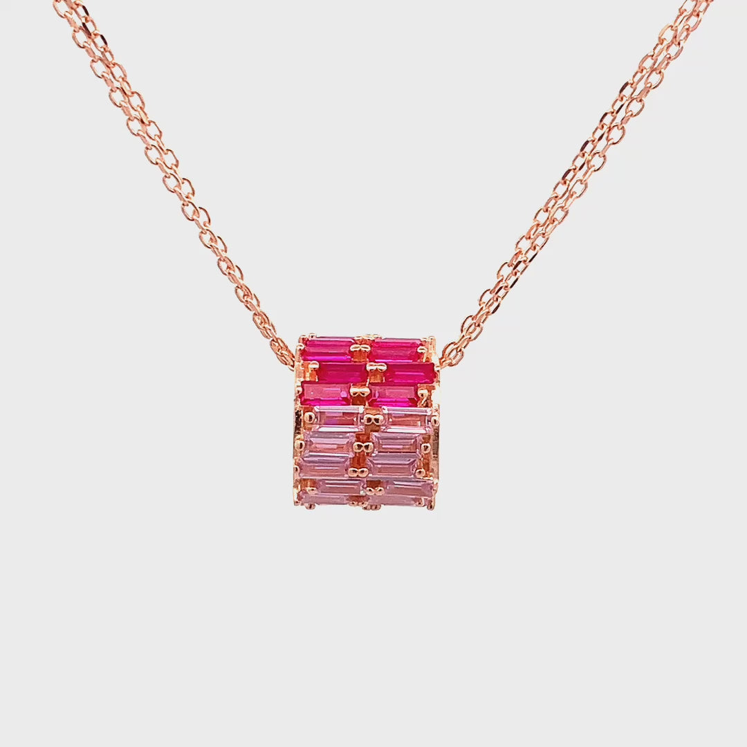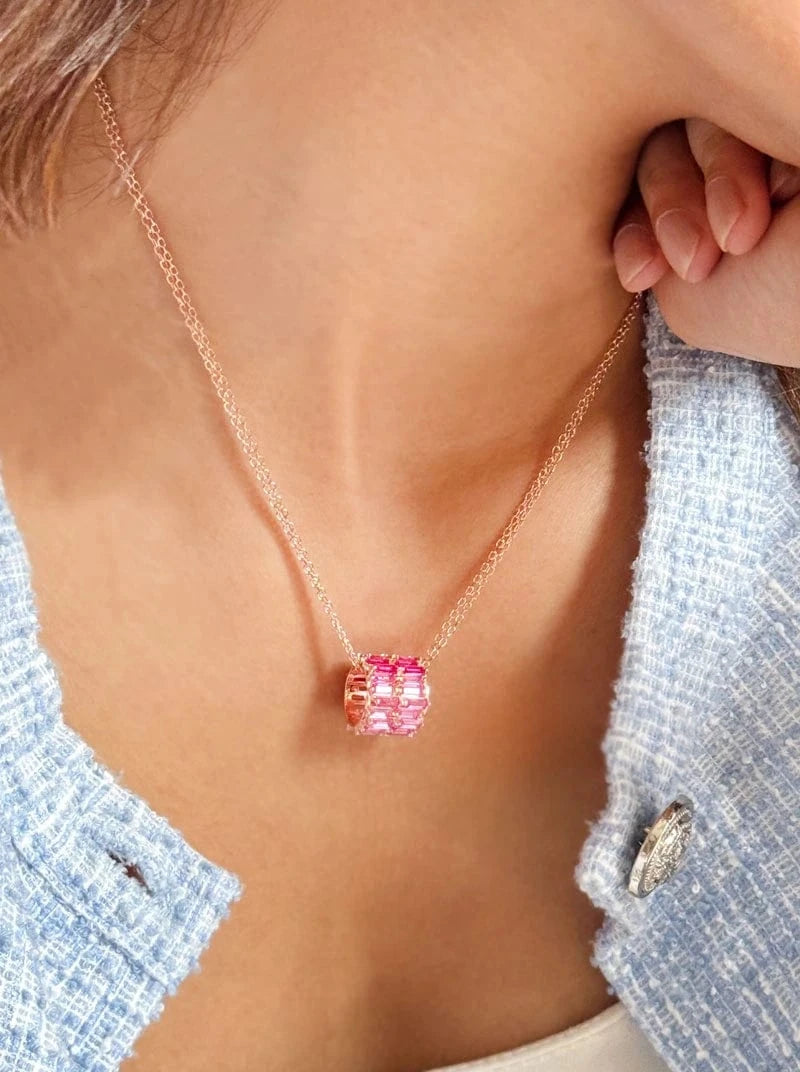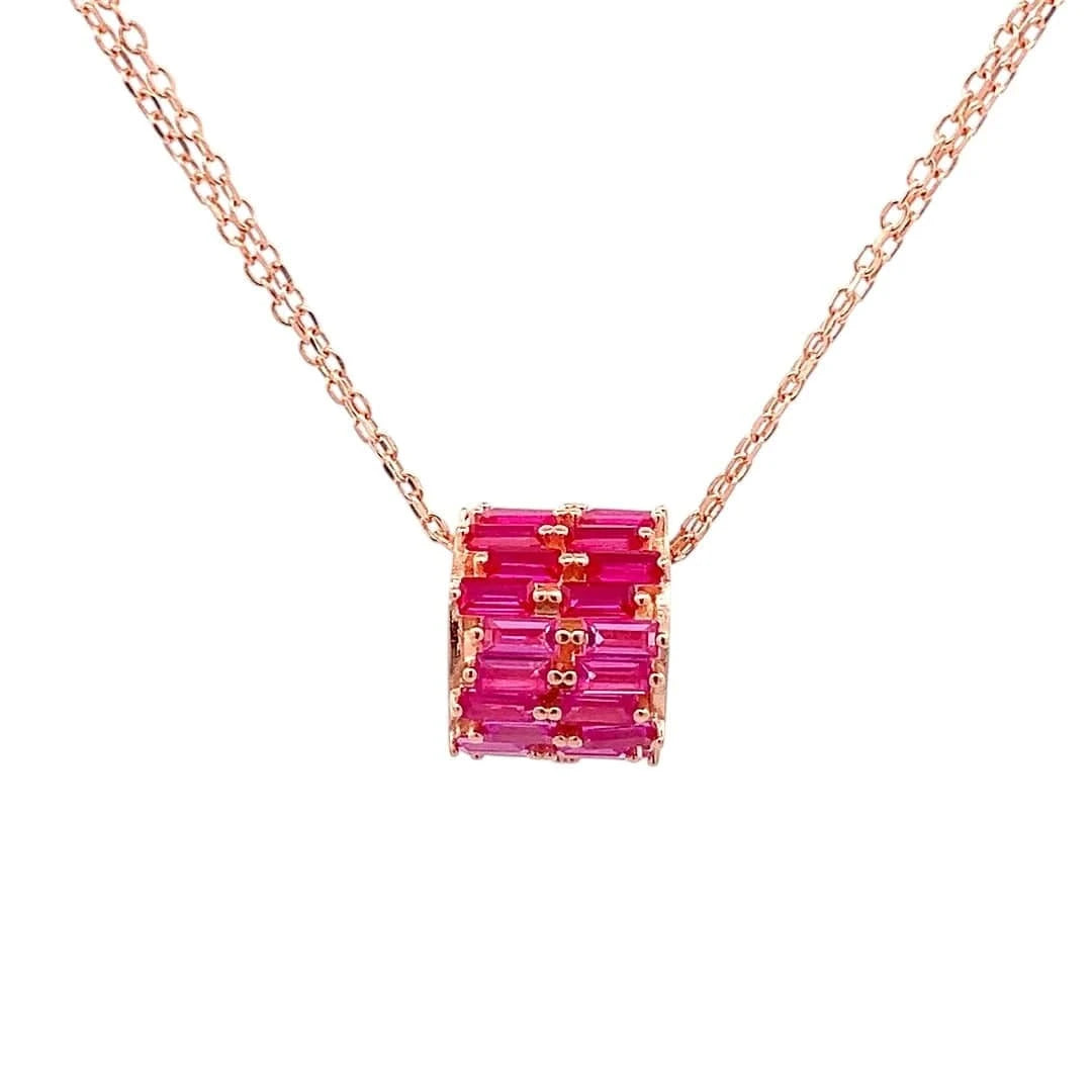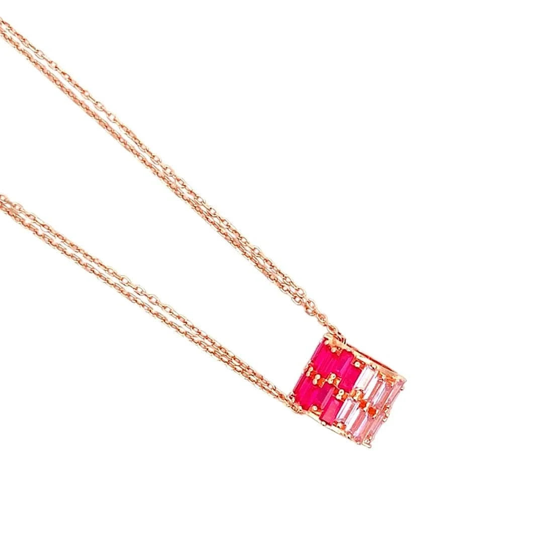 Delicate and radiant, the Roll of Pink Trio Pendant Chain celebrates the elegance of layered color and refined design. Three shades of pink baguette stones are meticulously arranged in two rows along the roll, creating a cascading display of shimmer and depth that catches the light from every angle. Suspended on a double chain, this pendant blends contemporary sophistication with timeless femininity, making it a striking statement for any occasion. Whether gifted to a loved one or worn as an expression of your own style, the Roll of Pink Trio Pendant Chain embodies charm, grace, and captivating allure. Let its dual-rowed pink hues illuminate your look with effortless elegance.