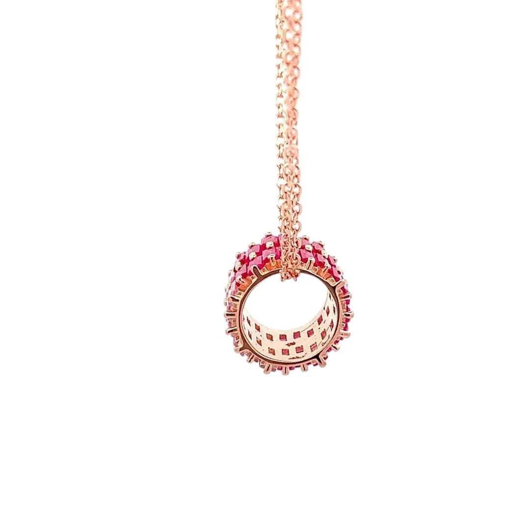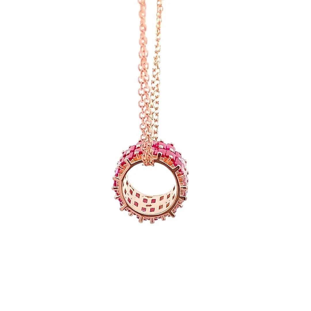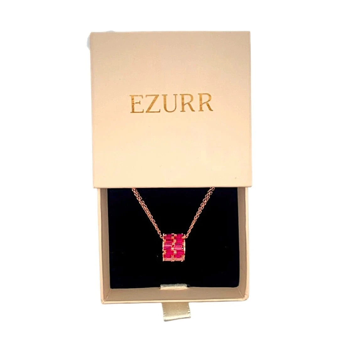 Delicate and radiant, the Roll of Pink Trio Pendant Chain celebrates the elegance of layered color and refined design. Three shades of pink baguette stones are meticulously arranged in two rows along the roll, creating a cascading display of shimmer and depth that catches the light from every angle. Suspended on a double chain, this pendant blends contemporary sophistication with timeless femininity, making it a striking statement for any occasion. Whether gifted to a loved one or worn as an expression of your own style, the Roll of Pink Trio Pendant Chain embodies charm, grace, and captivating allure. Let its dual-rowed pink hues illuminate your look with effortless elegance.