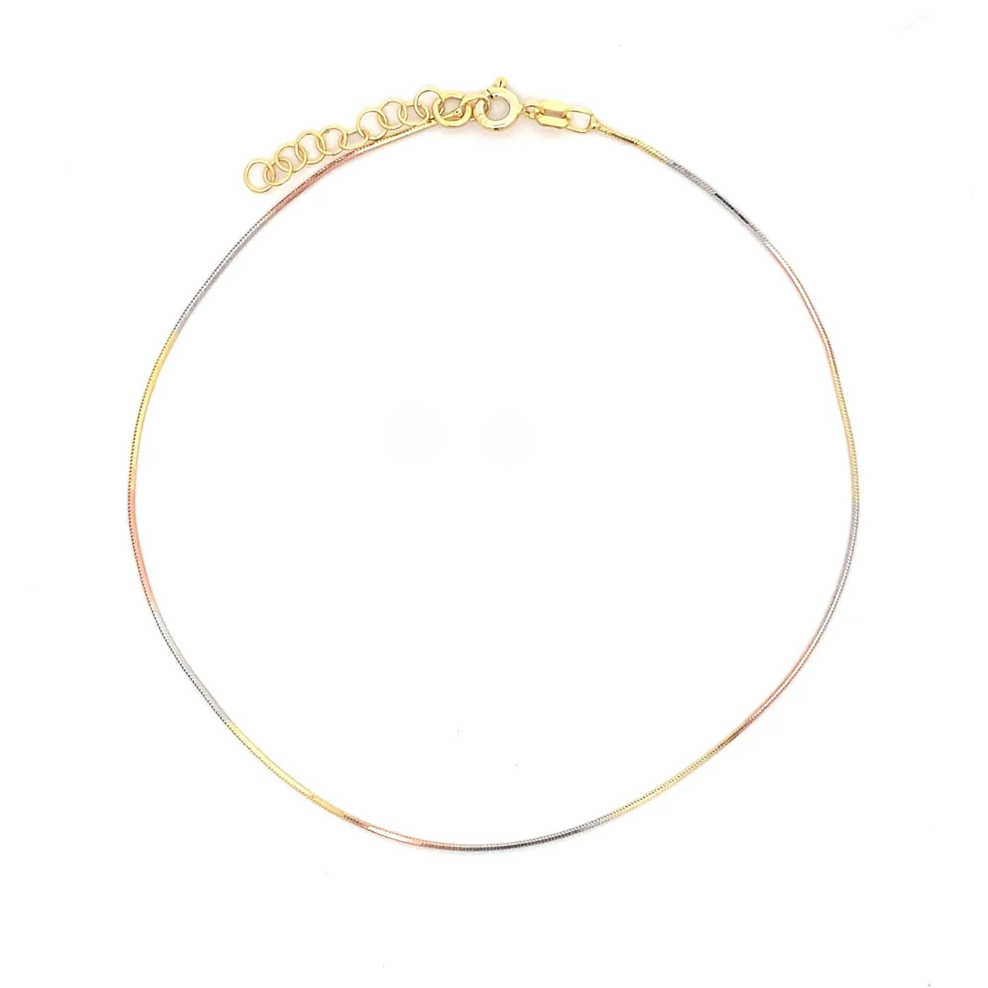 Elevate your style with our Triple Tone Ultra Thin (Single) Anklet, expertly crafted to showcase a striking combination of silver, rose gold, and gold tones. This ultra-thin Single anklet features a delicate design, perfectly balancing elegance and sophistication. The triple tones add a touch of versatility, allowing you to effortlessly mix and match with your favorite outfits. Whether you're looking for a chic accessory to elevate your everyday look or a stylish gift for someone special, this anklet is sure to impress. This listing is for a single anklet only, not a pair. Make a statement with this refined and eye-catching anklet.