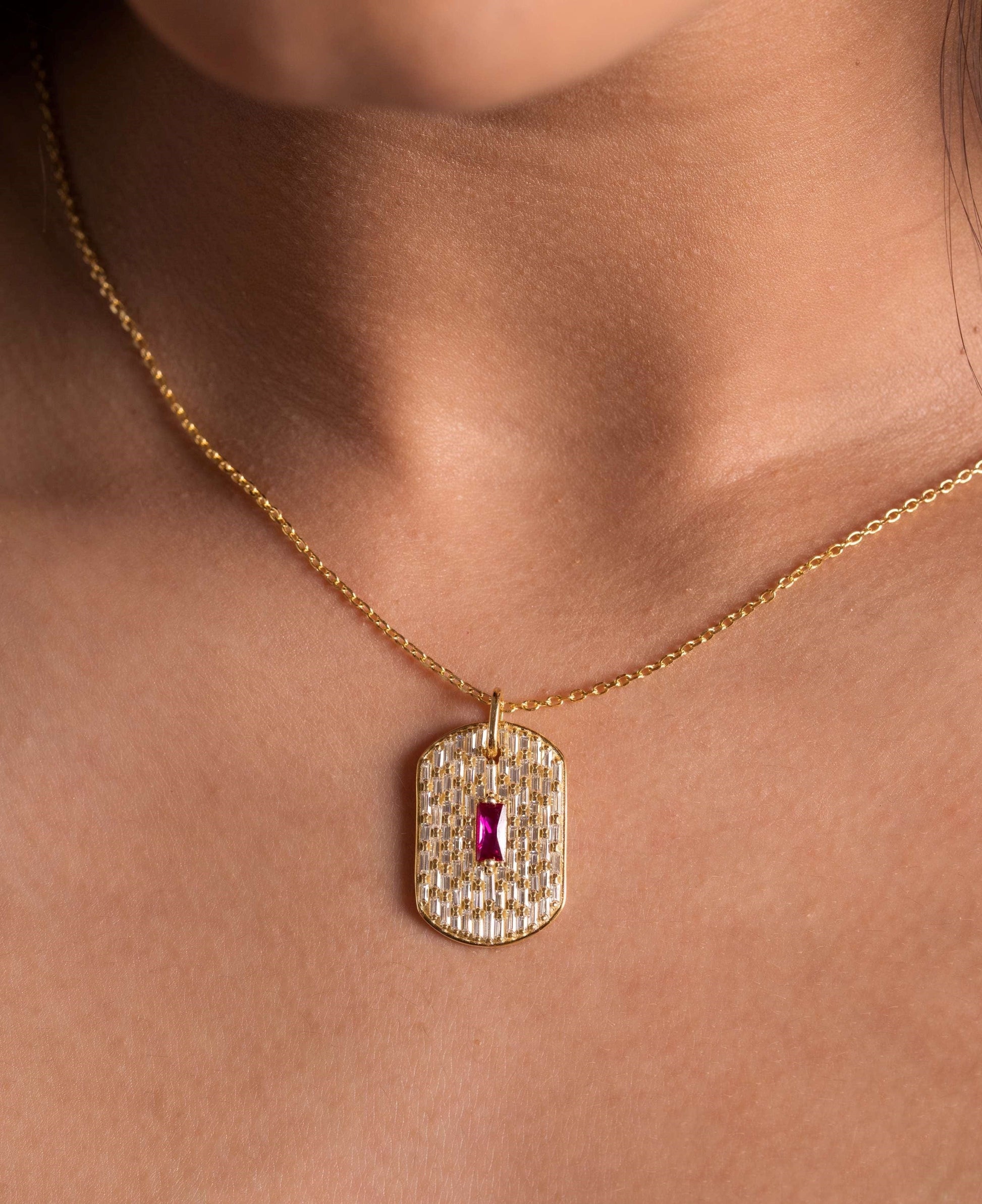 Bold and radiant, our Valor Pendant Chain redefines modern elegance with a striking blend of color and brilliance. The pendant is fully adorned with precisely set baguette stones, culminating in a vibrant pink baguette at its center that draws the eye and captures the light with every movement. Its sleek, polished frame complements the geometric sparkle, creating a sophisticated statement piece that is both contemporary and timeless. Whether gifted to a loved one or worn as a reflection of your own confidence, the Valor Pendant Chain embodies strength, elegance, and captivating allure. Let its shimmering pink center and dazzling baguettes inspire courage, beauty, and bold sophistication in every moment.